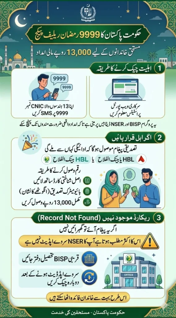 The 9999 Ramzan Package is a government-supported financial assistance program designed to help low-income families during the holy month. Under this initiative, eligible households receive Rs 13,000 to manage food and essential expenses during Ramzan.