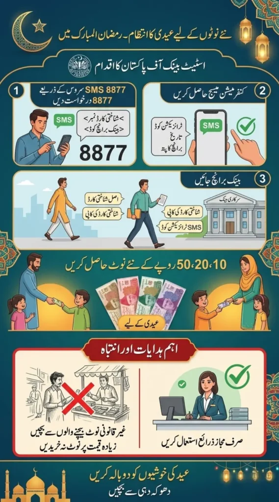 Getting new currency notes for Eid-ul-Fitr in Pakistan has become much easier thanks to the systems introduced by the State Bank of Pakistan. By using official methods like the 8877 SMS service, visiting bank branches, or checking ATMs, citizens can obtain fresh notes without difficulty.