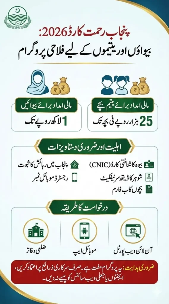 The Punjab Rehmat Card 2026 is a welfare program launched by the Punjab government to provide financial assistance to widows and orphan children. The scheme aims to help families who have lost their main earning member by offering direct financial support for household expenses, education, and basic needs.