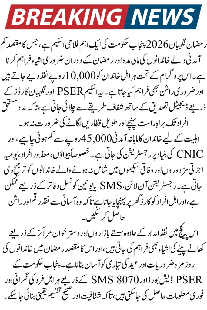 The Ramzan Nigehban Package 2026 is a lifeline for low-income families across Punjab. By combining cash grants, ration support, and digital verification, the program ensures dignity, transparency, and accessibility. Early registration and verification via PSER or SMS allow families to secure timely assistance, helping them celebrate Ramadan with ease and confidence. For updates, always rely on official channels like the PSER portal and the 8070 SMS service.